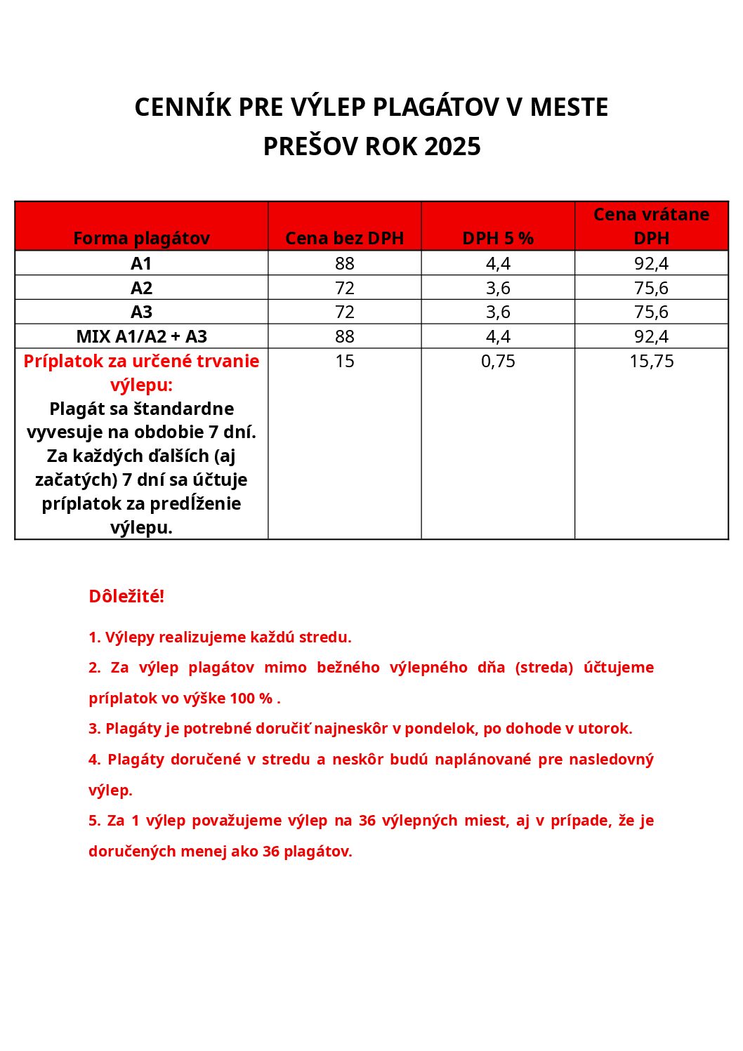 Mestský podnik služieb Prešov má pod palcom 36 výlepných miest po celom meste. Výlep plagátov s nami vybavíte rýchlo a bez starostí. Stačí nás kontaktovať a vyplniť jednoduchý formulár – o zvyšok sa už postaráme my.